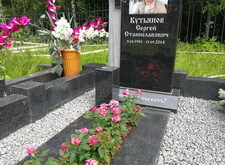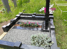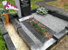 Затем приносим надгробье, предварительно укрепив на нём фотокерамику с изображением усопшего, устанавливаем его. Территорию участка засыпаем каменной крошкой, в цветник сажаем растения, в одном из углов места захоронения организовываем клумбу.